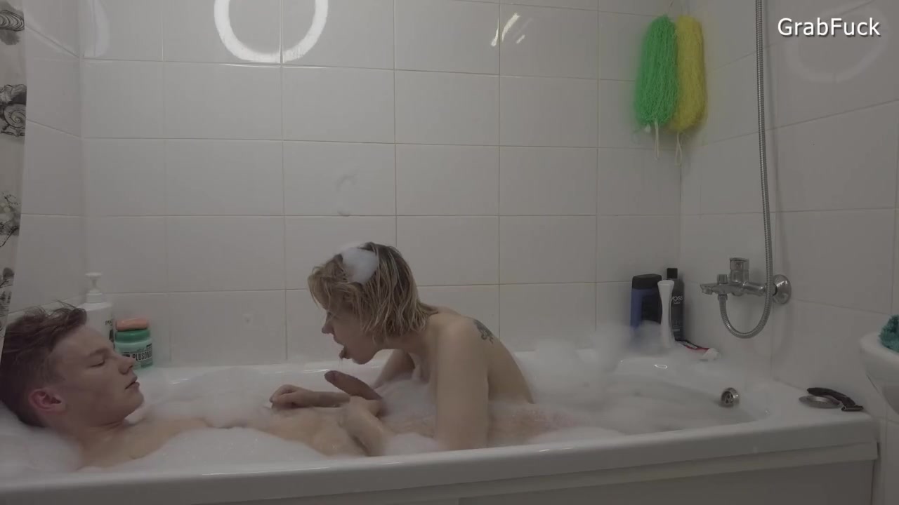 «После трудного дня, русская молодая пара решила расслабиться и принять ванную. Они оба разделись, наполнили ванную пеной и уместились в нее. Первым делом девушка взяла инициативу на себя и начала подрачивать своему парню, после чего принялась ему отсасывать. Закончив с этим делом, она повернулась и встала раком, чтобы ее возлюбленный мог ей засадить, чем он незамедлительно и занялся. Чувствуя что вот-вот кончит, он высунул свой член из ее влажной вагины и начал стремительно дрочить смотря ей в глаза, что привело к семяизвержению на ее личико.»