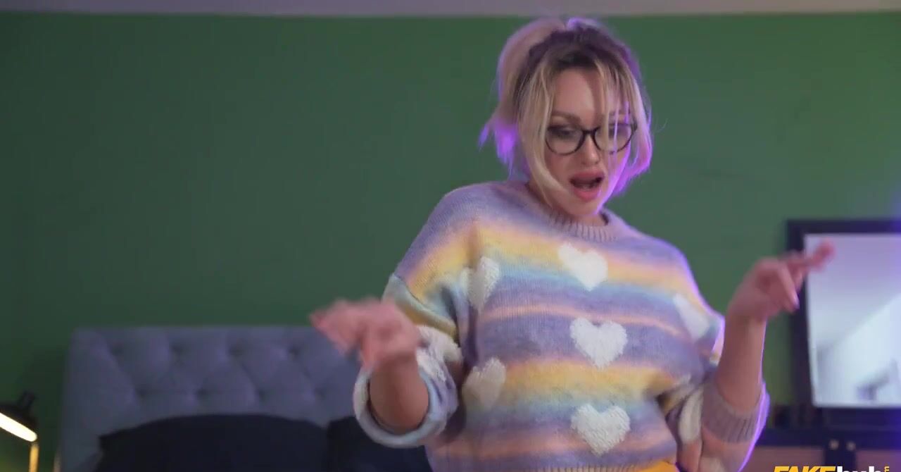 «Пока бойфренд работает, блондинка за его спиной упражняется в танцах. В какой-то момент белокурая красотка решает показать любимому всё, что умеет. Она начинает танцевать и показывает свою упругую попку, поднимаю юбку, а так же силиконовые сиськи, задирая свитер. Такие действия девчонки возбуждают парня, который спешит достать большой хуй со штанов. Довольная проказница сделала смачный минет и насладилась сексом.»
