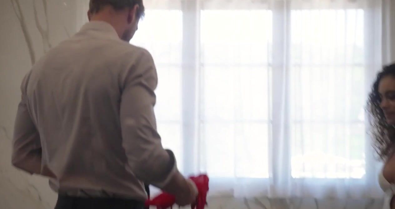 Красивая падчерица мулатка в красном белье соблазняет отчима