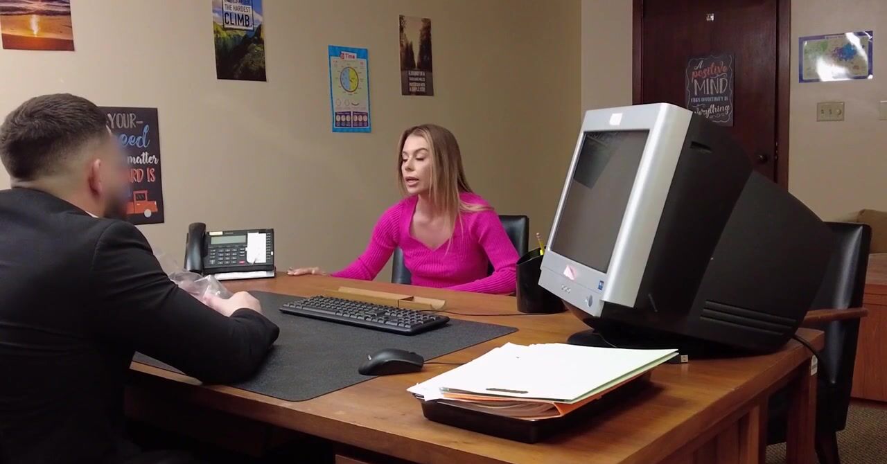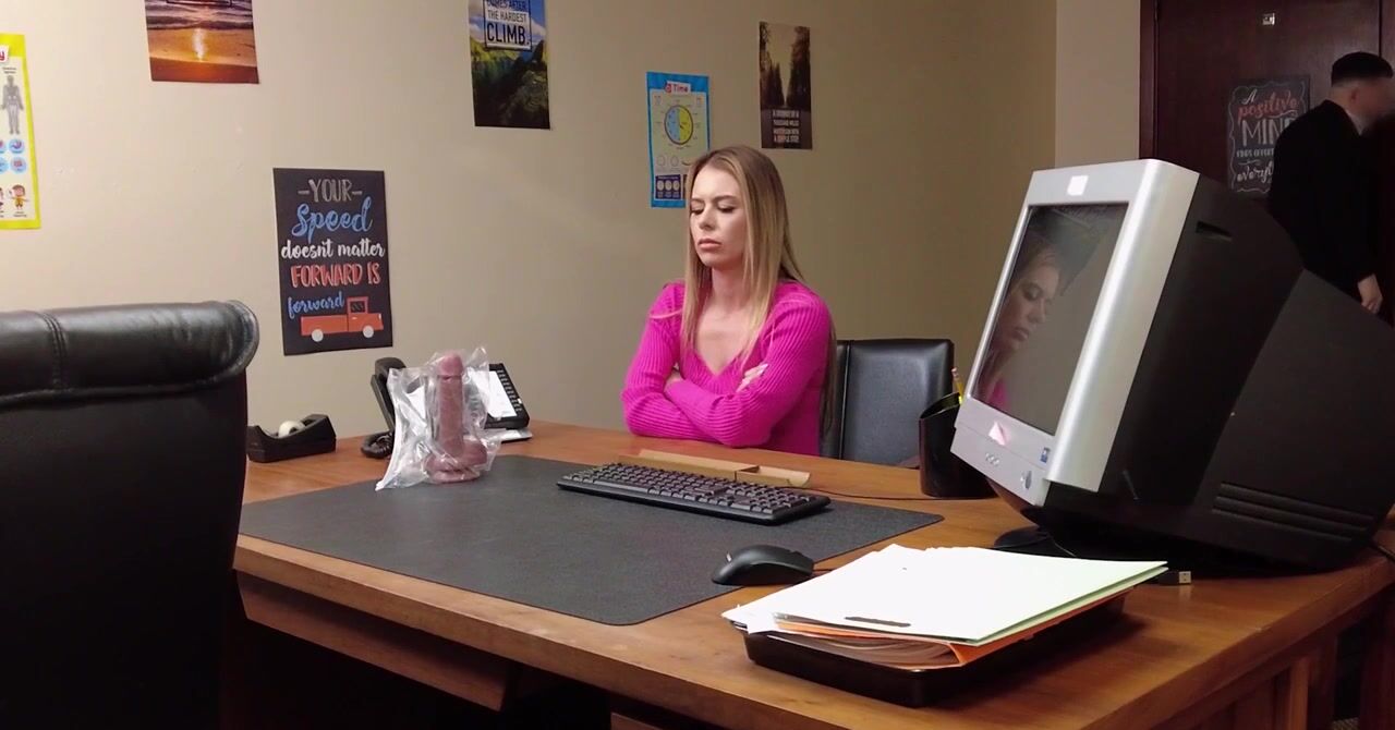«Начальник находит дилдо в рабочем столе своей подчиненной и вызывает её к себе в кабинет, чтобы серьезно поговорить. Женщина не должна мастурбировать на работе, даже если ей безумно хочется, за это её могут даже уводить. Но босс может и закрыть глаза на проступок худенькой дамочки, нужно всего лишь удовлетворить его как следует и он закроет глаза. Приходится стройной милфе сосать его хуй и давать в пизду.»