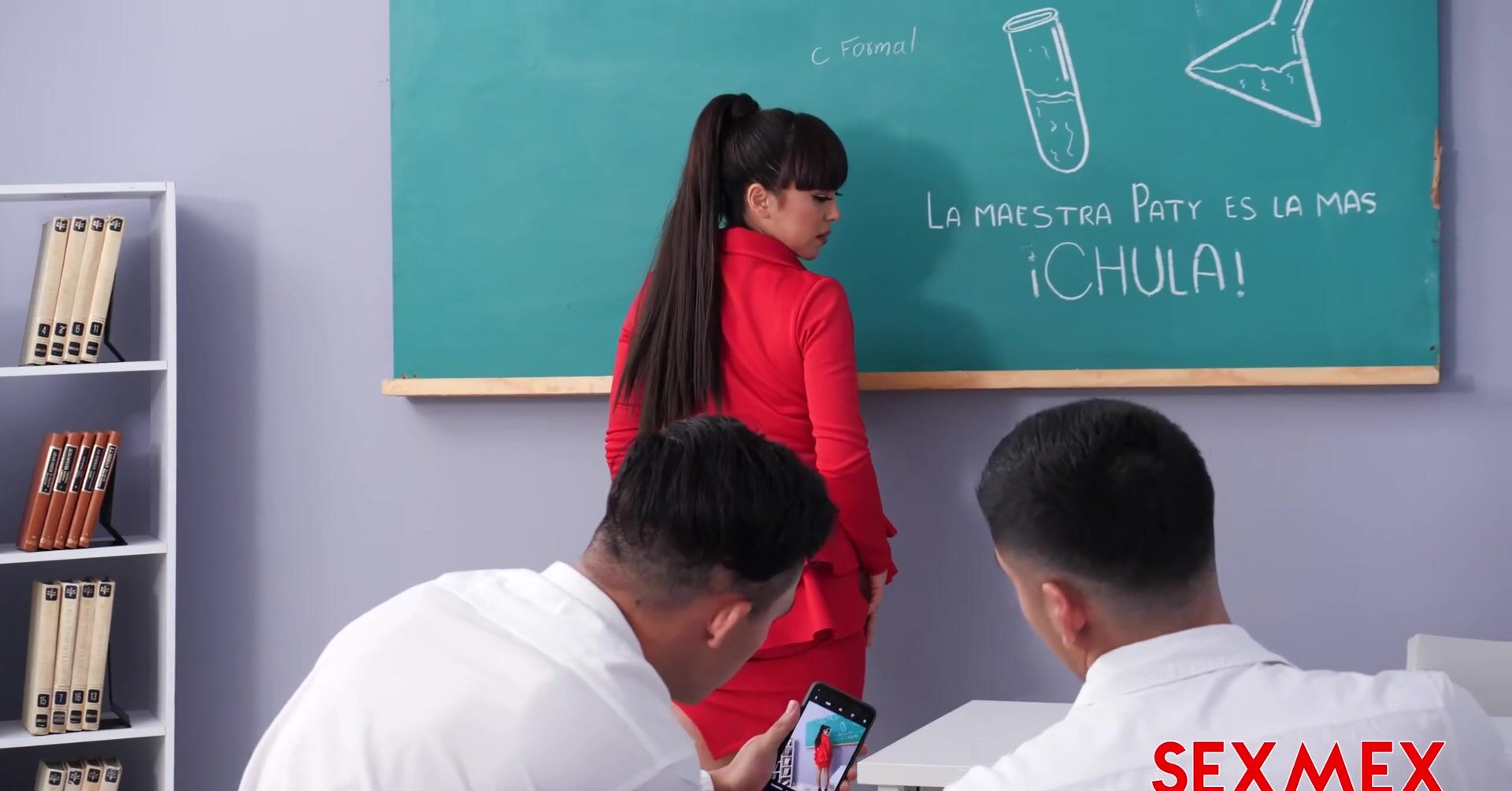 «Латинской учительнице в красном платье всё надоело, она ужасно устала от работы, поэтому и решила заняться сексом с одним студентом, пока второй завистливо смотрел, снимая еблю на телефон. Черноволосая бестия взялась смачно отсасывать хуй пацана, после чего отдалась ему на столе, получая удовольствие от вагинального секса. Жаркая брюнетка с силиконовыми сиськами и соблазнительной попкой бурно кончила несколько раз.»