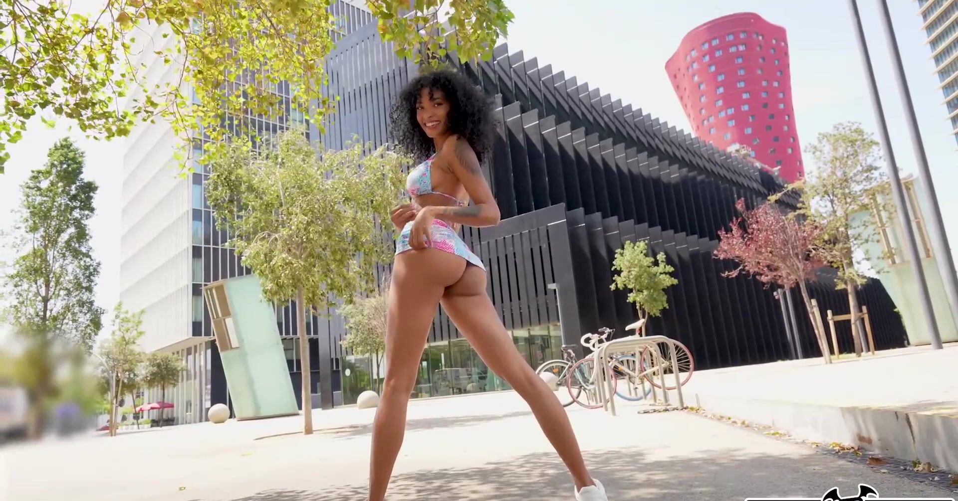 «Красивая негритянка расхаживает по городу в откровенном купальнике и показывает своё шикарное тело. Уже вскоре чернокожая проказница с кудрявыми волосами находит мужика, который соглашается её выебать. Трахаться они собираются на мосту, по которому уже давно никто не ходит. Там игривая крошка принимается делать глубокий минет и отдается в пизденку. Она оторвалась по полной, получив нереальный кайф от такой ебли.»