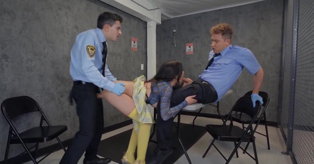 «Охранники в аэропорту задерживают красивую телку в короткой юбке. Мужикам ещё во время досмотра становится понятно, что телка безумно развратная, поэтому они отводят её в комнату для допросов, где угощают цыпочку крепкими членами. Она не отказывается от минета и ебли втроем, фигуристая крошка в желтых чулках берется страстно работать ротиком и сосет болты, а потом отдается в вагину и получает нереальный кайф.»