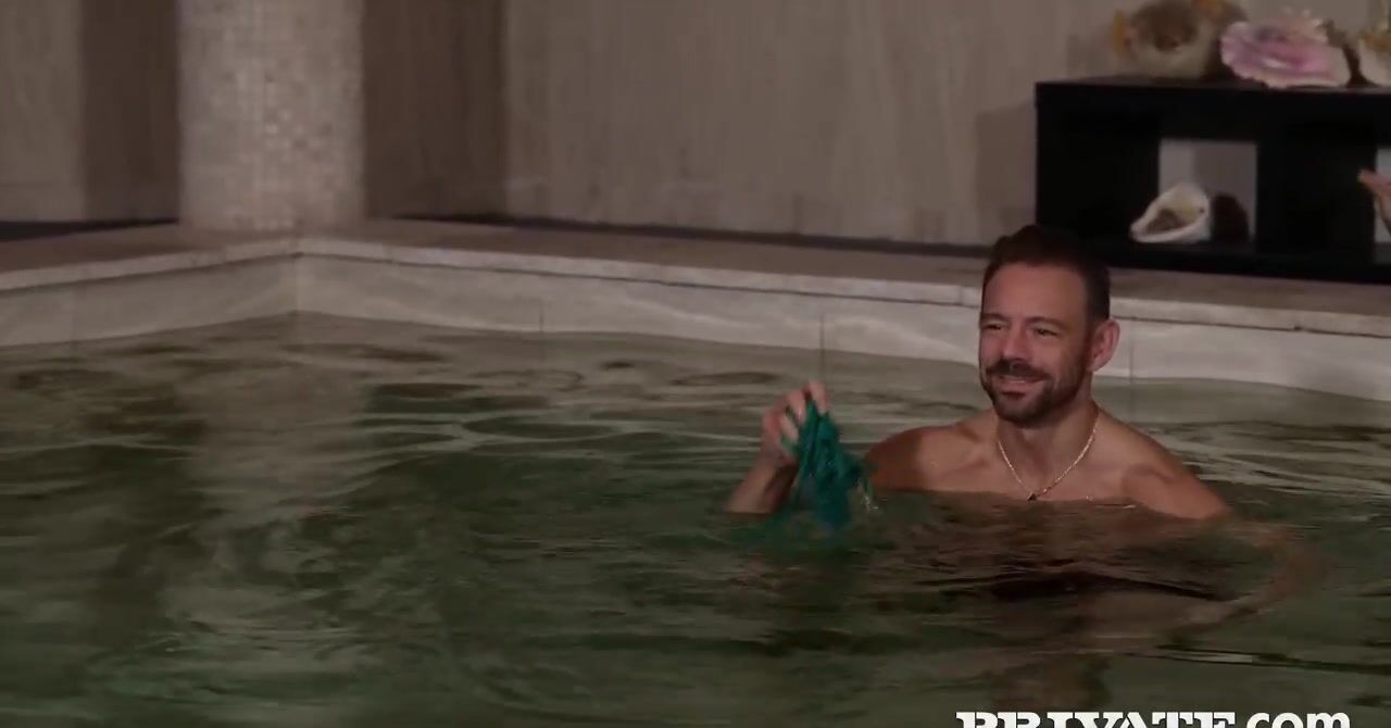 Девка с анальной пробкой в жопе плавает в бассейне и отдается мужику