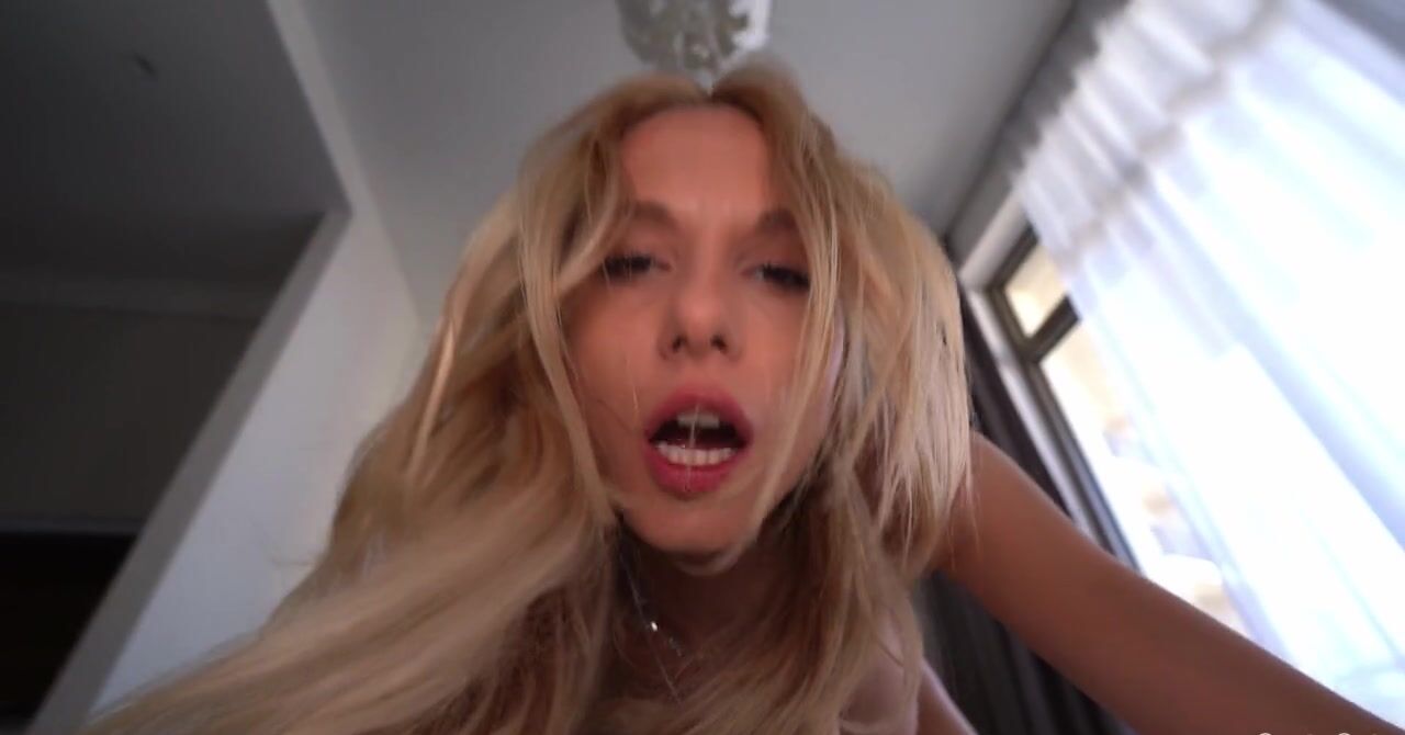 «Мужик имеет дело с красивой блондинкой с силиконовыми сиськами, которая обожает заниматься жестким сексом. Эта жаркая проказница расставляет перед ним ноги в стороны и получает удовольствие. Она сама просит партнера, чтобы тот засаживал хуй в её бритую пизду резко и по самые яйца. Когда же бойфренд готовится кончать, стройная сучка спешит подставить лицо под сперму, ей безумно нравится, когда конча заливает мордашку.»