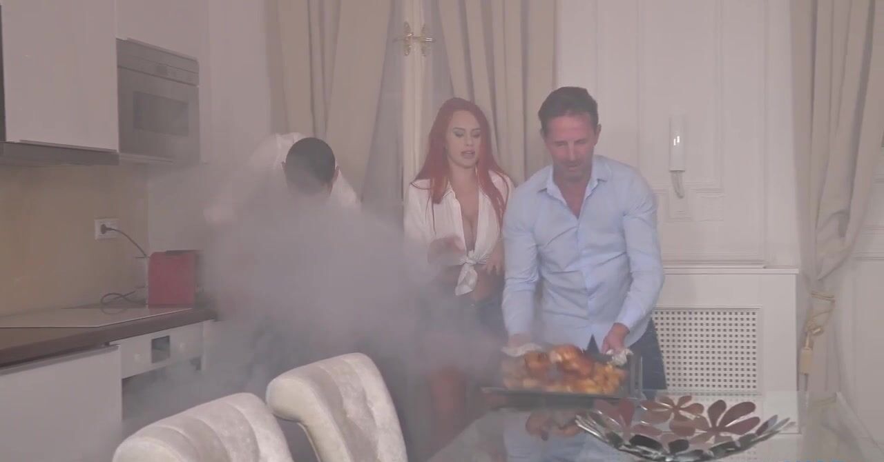 «Рыжая телка пригласила друзей на ужин и поставила курицу в духовку, а сама решила приласкать пизду, надеясь успеть это сделать перед приходом гостей. Привлекательная девка так увлеклась, что еда сгорела, а вместо ужина она предложила ребятам лучше заняться сексом втроем. Мужчины согласились, что это намного лучше еды. Жаркая бестия с большими натуральными сиськами взялась сосать члены и отдалась в обе дырки.»