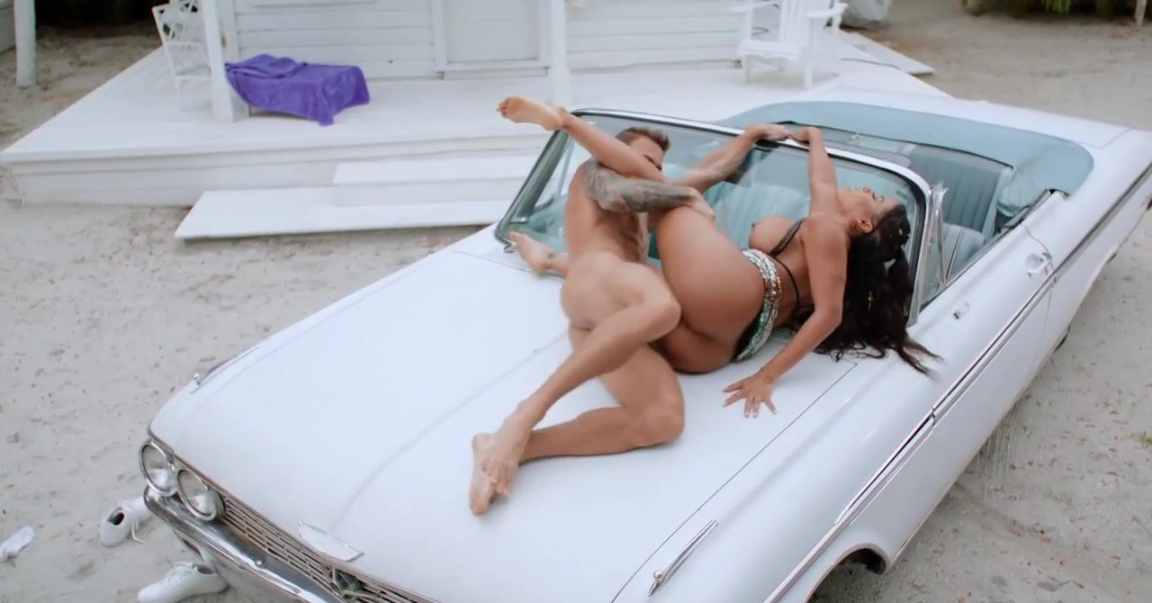 «Богатая красотка приезжает к парню и сразу же соблазняет его на секс. Это её любовник, который имеет большой хуй. Этот хер всегда доставляет зрелой бестии нереальный кайф. Она так возбуждена, что не может дойти до спальни, а отдается в киску прямо на капоте машины. Опытная сучка с силиконовыми сиськами не только наслаждается вагинальным сексом, но ещё и делает глубокий минет, а сперму принимает на лицо.»