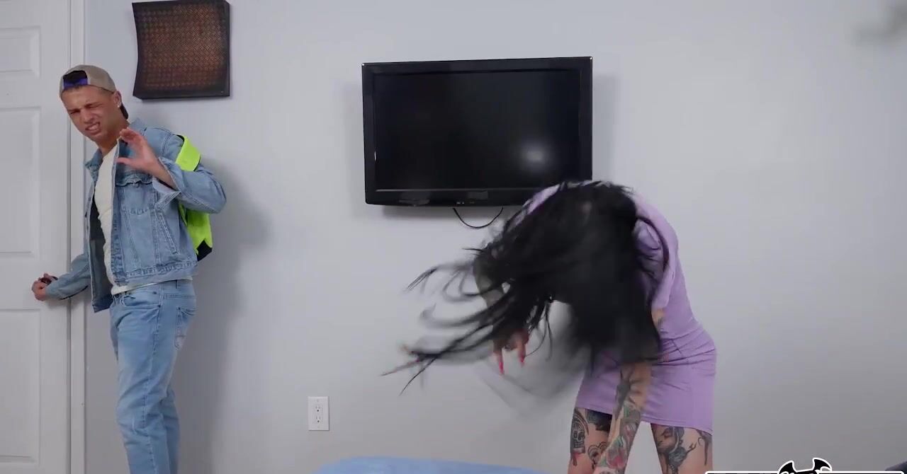 «Пацан снимает комнату в доме зрелой рокерши, которая слушает очень тяжелую музыку. Уже вскоре оказывается, что эта опытная брюнетка с большими силиконовыми сиськами и татуировками по всему телу ещё и жесткий секс без обязательств любит. Черноволосая милфа приглашает паренька к себе в спальню и разводит её на жаркую еблю. Во время полового акта развратница отдается в задницу и просит грубо её жарить.»