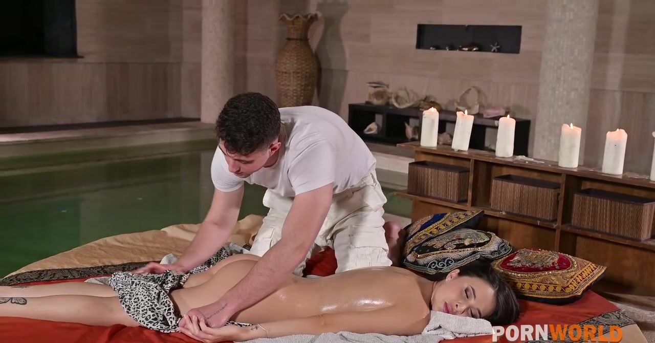 «Стройная жена проводит время с массажистом. Увлажненная маслом худышка соблазняет его на интим и принимается делать очень смачный минет, за чем её и застает супруг. Брюнетка не смущается, а предлагает ему присоединиться, ведь два хуя помог ей получить более сильный кайф. Муж быстро перестает злиться и достает свой пенис, которым он и трахает развратницу. Теперь черноволосая худышка наслаждается двойным проникновением.»