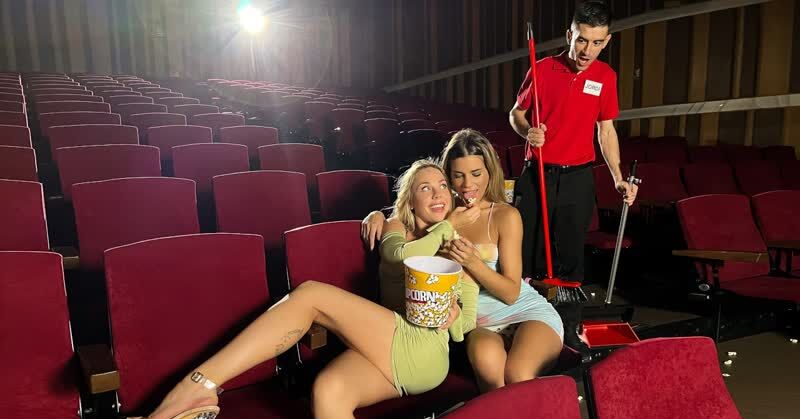 Работник кинотеатра страстно трахает двух телок после сеанса