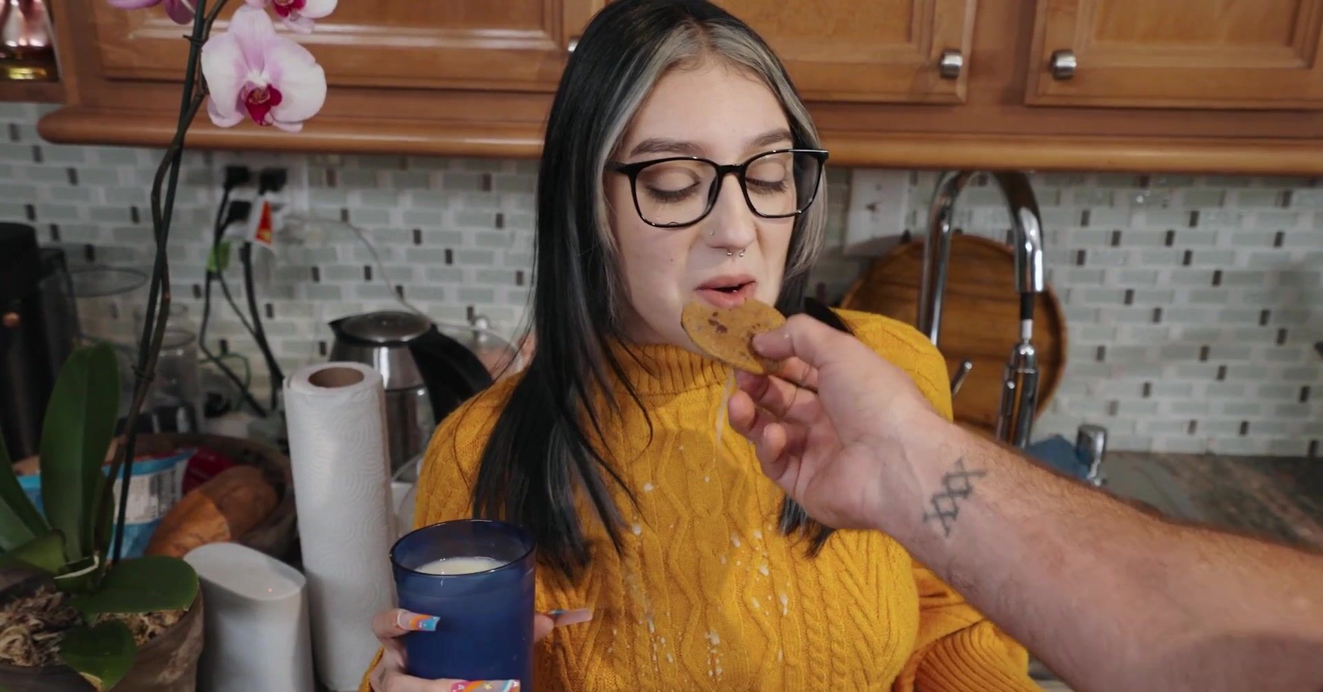 Милая девушка в очках угощает соседа печеньем и жарко с ним ебется