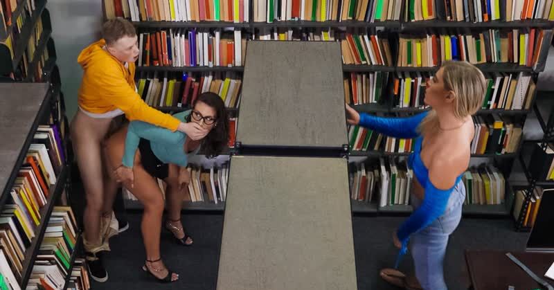 «Студент идет в библиотеку со своей белокурой девушкой, которая садится на учебники, а ему быстро становится скучно, ведь пацан не привык учиться. В этот момент его на интим соблазняет зрелая библиотекарша в очках, которая оказывается не только очень привлекательной женщиной, но и развратной. Эта черноволосая милфа принимается делать молодому пареньку глубокий минет и жарко с ним ебется на столе, пытаясь сдерживать стоны.»