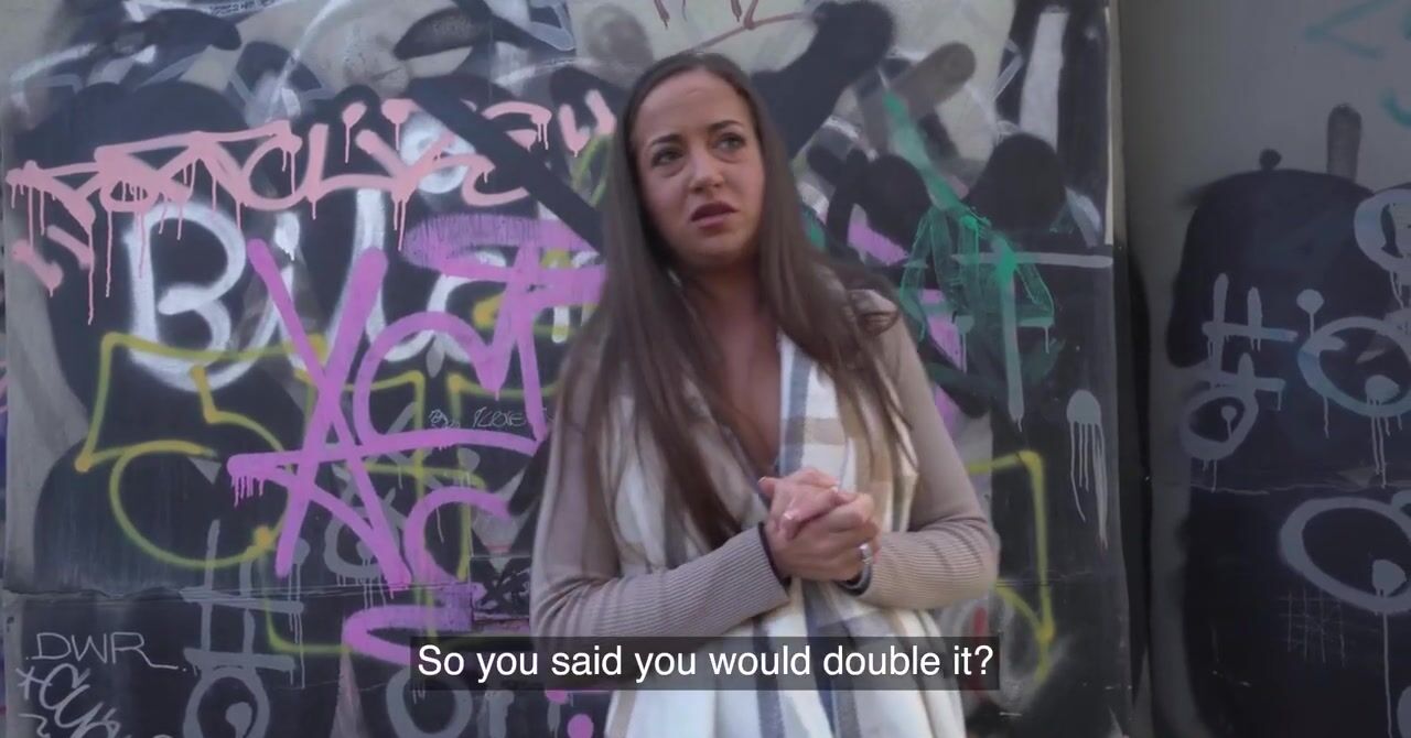 «Пикапер использует не слова, а деньги, чтобы развести на секс привлекательную брюнетку. Черноволосая девушка видит огромную сумму и соглашается на всё, за такую солидную плату она готова стать проституткой, хотя всегда говорила о том, что никогда не займется сексом за деньги. Но теперь развратница нарушает своё слово и отсасывает хуй прямо на улице. Она ещё и киску сегодня с утра удачно побрила, так что ебаться ей было не стыдно.»
