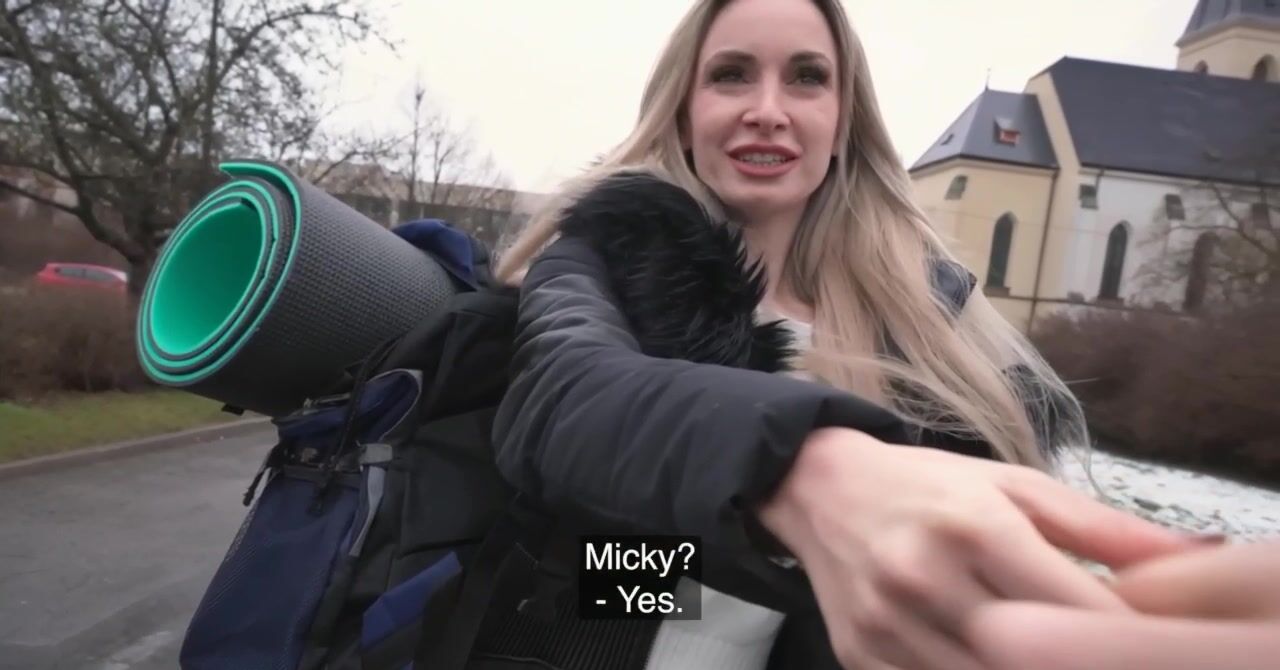 «Привлекательная туристка сразу же показывает сиськи на улице, как только пикапер предлагает за это хорошо заплатить. Он увидел, что блондинка развратна и пригласил её к себе, обещая больше деньги уже за секс. Девка с силиконовой грудью отказываться не стала, она насладилась толстым членом незнакомца и хорошо провела время. Развратница смачно отсосала хер и насладилась вагинальной еблей, а сперму получила на лицо.»