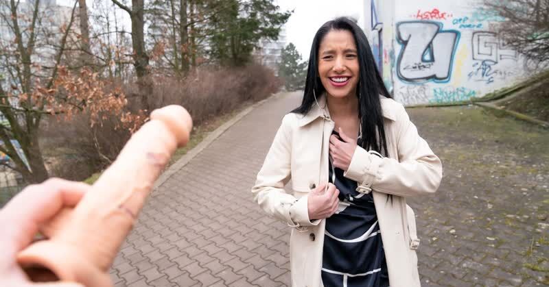 «Симпатичная брюнетка шла по делам, но уже вскоре планы пришлось поменять, ведь пикапер предложил ей очень хороший заработок. От привлекательной девки требовалось пососать искусственный хуй на улице, а потом сделать ему минет и отдаться в киску. Черноволосая цыпочка сделала это, она ведь не стеснительная особа и любит ебаться. Крошка сама получила удовольствие, толстый болт незнакомца подарил ей бурный оргазм.»