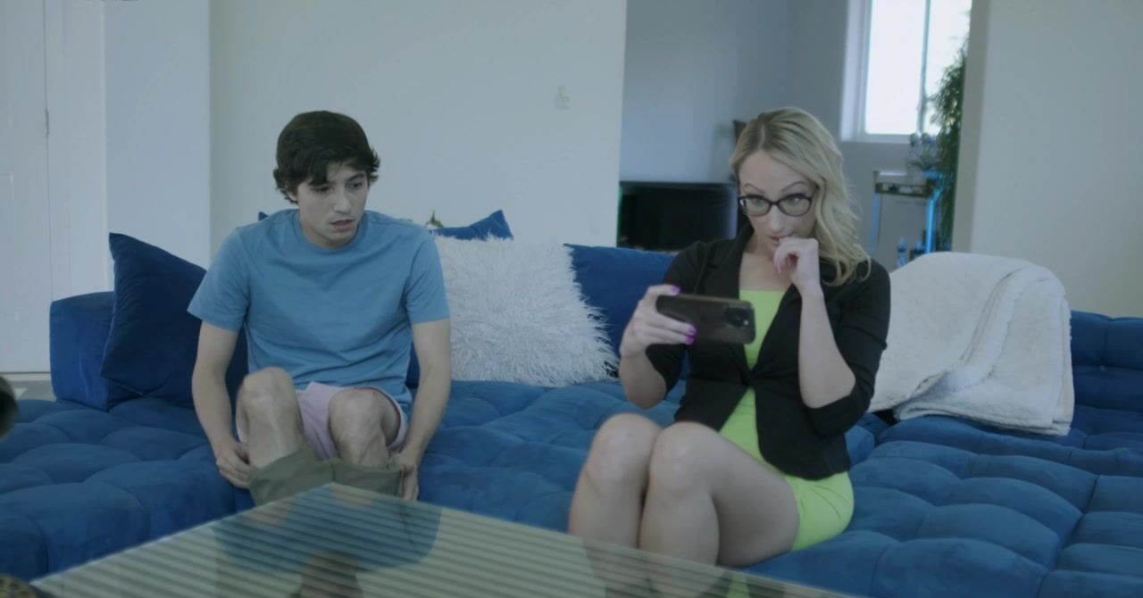 «Привлекательная мачеха в очках узнает, что у пасынка настоящая порно зависимость, он смотрит новые ролики пока разговаривает с ней. Белокурая мамочка решает излечить его сексом. Она отбирает телефон и показывает обнаженное тело. Милфа отодвигает трусы и приказывает пацану вылизывать её пизду, что тот делает с огромным удовольствие. Он принялся полировать пилотку мачехи, а потом насладился минетом и сексом.»