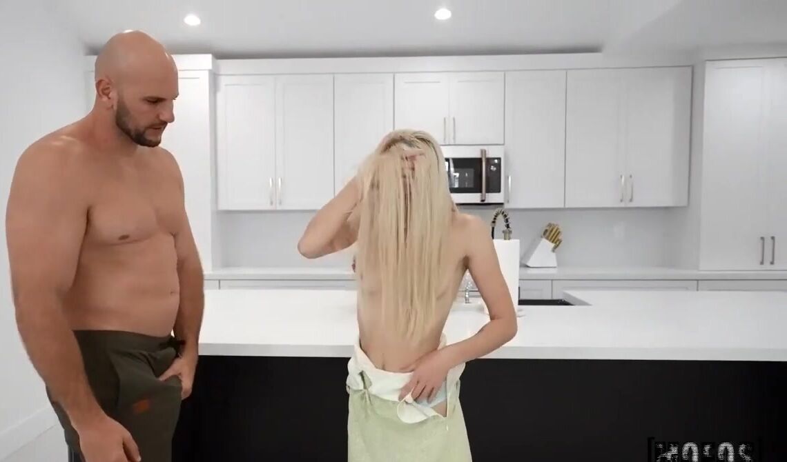 «Стройная блондинка хвастается своей гибкостью, она может закинуть ноги за голову. Это очень круто, гибкость будет полезна в сексе, всегда шикарно, когда телку можно трахать в любой позе. Лысый мужлан пользует эту развратницу по полной программе. Он кладет её на кухонный стол и трахает цыпочку как в мокрую киску, так и в глотку, она делает ему глубокий минет. А ещё девчонка очень легкая, так что её можно трахать и на весу.»