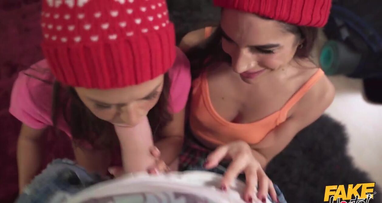 Приваленные елкой подруги отдаются другу в киски, благодаря его
