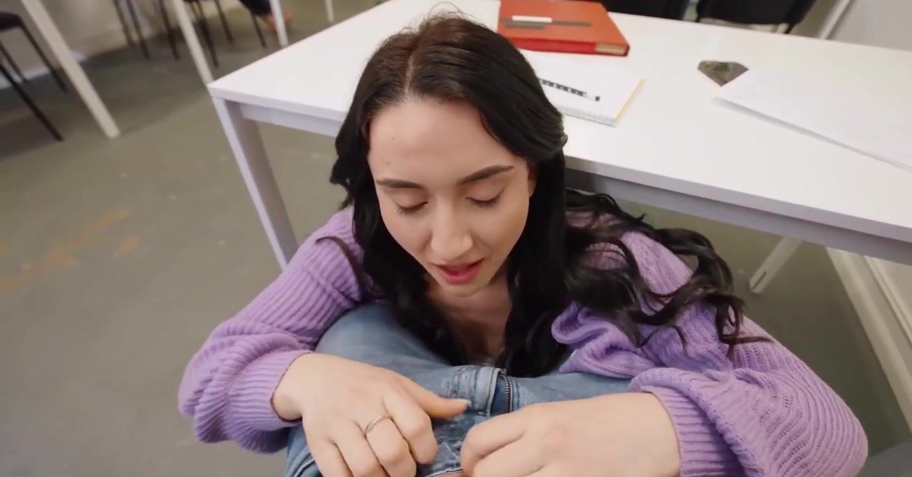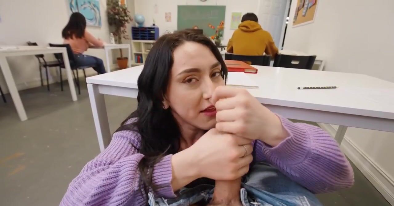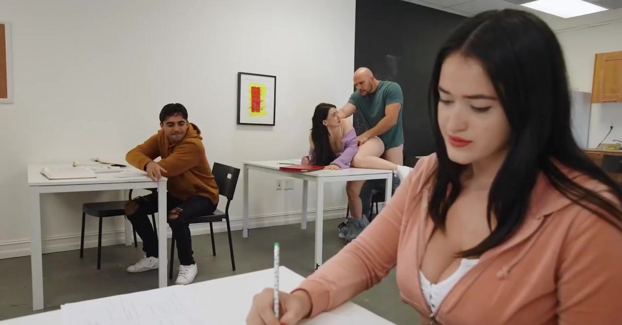 «Студентка во время пары залезает под парту однокурсника и достает толстый член с его штанов, принимаясь делать глубокий минет. Девка так возбуждена, что не переживает, что преподавательница её застанет за этим делом. Далее цыпочка показывает сочную попку, в которой находится анальная пробка. Лысый чел достает игрушку в задницы и принимается активно жарить развратницу, а кончает он ей на высунутый язык.»