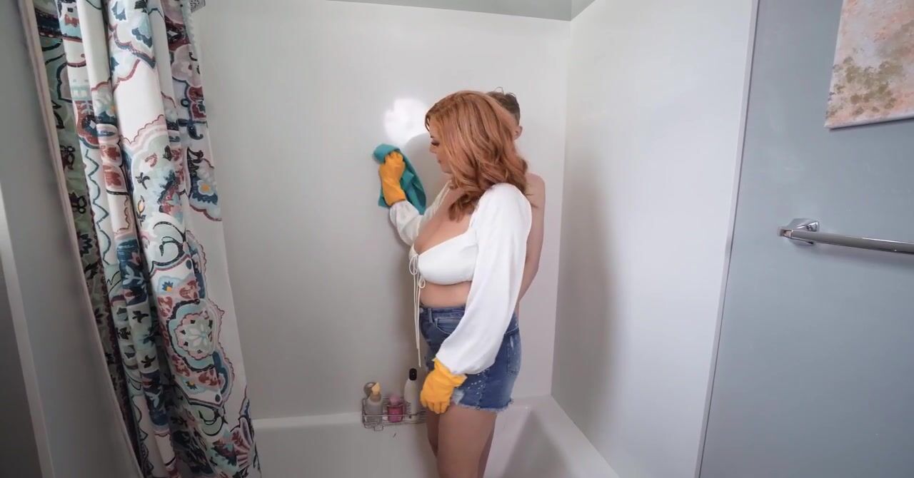 Мачеха отвлекается от уборки и ебется с пасынком в душе