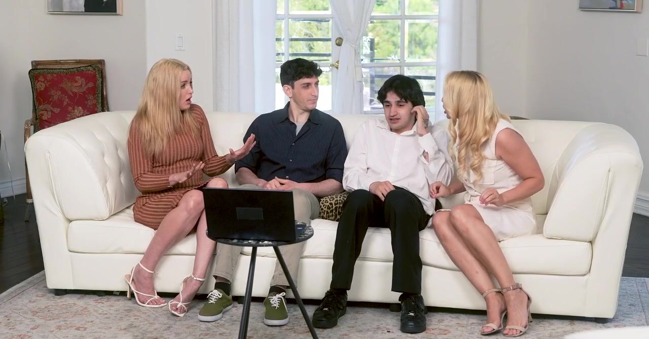 «У двух зрелых подруг есть взрослые сыновья, у которых ещё не было сексуального опыта. Поэтому эти белокурые подруги решают заняться сексуальный образованием парней. Они включают порно и смотрят развратный фильм вместе с парнями, комментируя всё в процессе, чтобы тем было понятно. Но вскоре зрелые бестии так возбуждаются, что решают более наглядно всё показать и отдаются молодчикам в киски, а так же принимаются сосать их члены.»