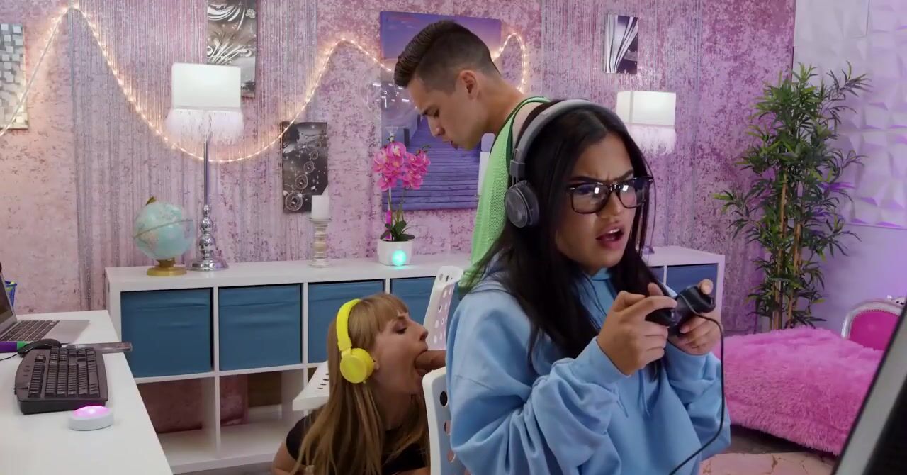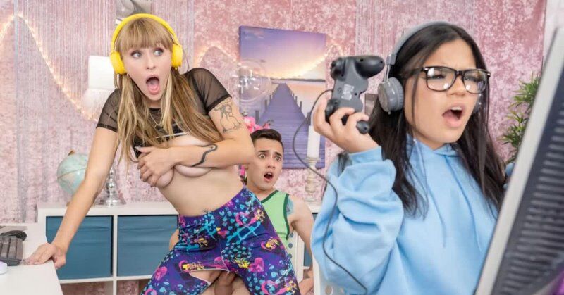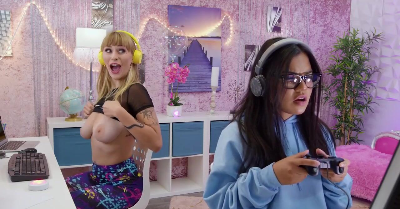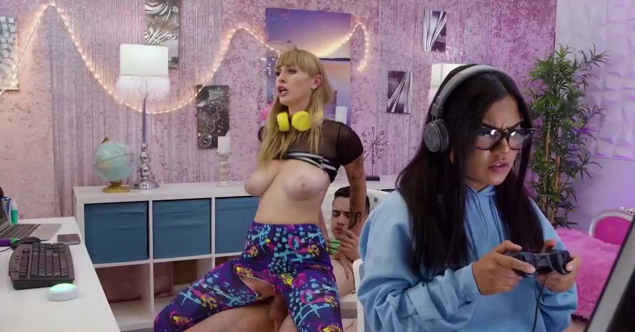 «Грудастая блогерка общается со своими подписчиками и ласкает себя за спиной подруги, которая играет в игры. Белокурая девчонка показала свои большие натуральные сиськи и киску, а вскоре ещё и соблазнила парня подруги на интим. Сексом они занялись тоже за спиной у увлеченной телки, которая за игрой не заметила измену. Чел как следует отжарил грудастую проказницу и спустил ей сперму в ротик, после её оргазма.»