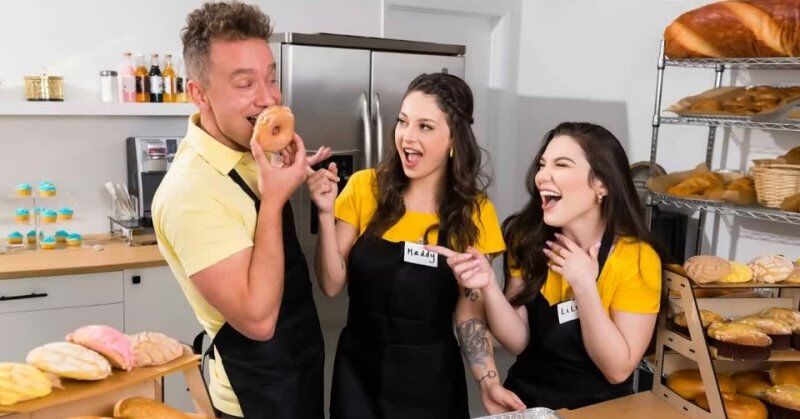 «Две развратные работники пекарни должны были бы месить тесто, но вместо этого они на столе вылизывают пизденки друг дружки, а так же трутся кисками и получают удовольствие от лесбийского секса. Уже вскоре на смену приходит парень, который угощает развратниц своим крепким членом. Теперь они все могут заняться еблей втроем. Двум черноволосым красоткам нравится такой секс, они так возбуждаются, что даже в попки отдаются.»