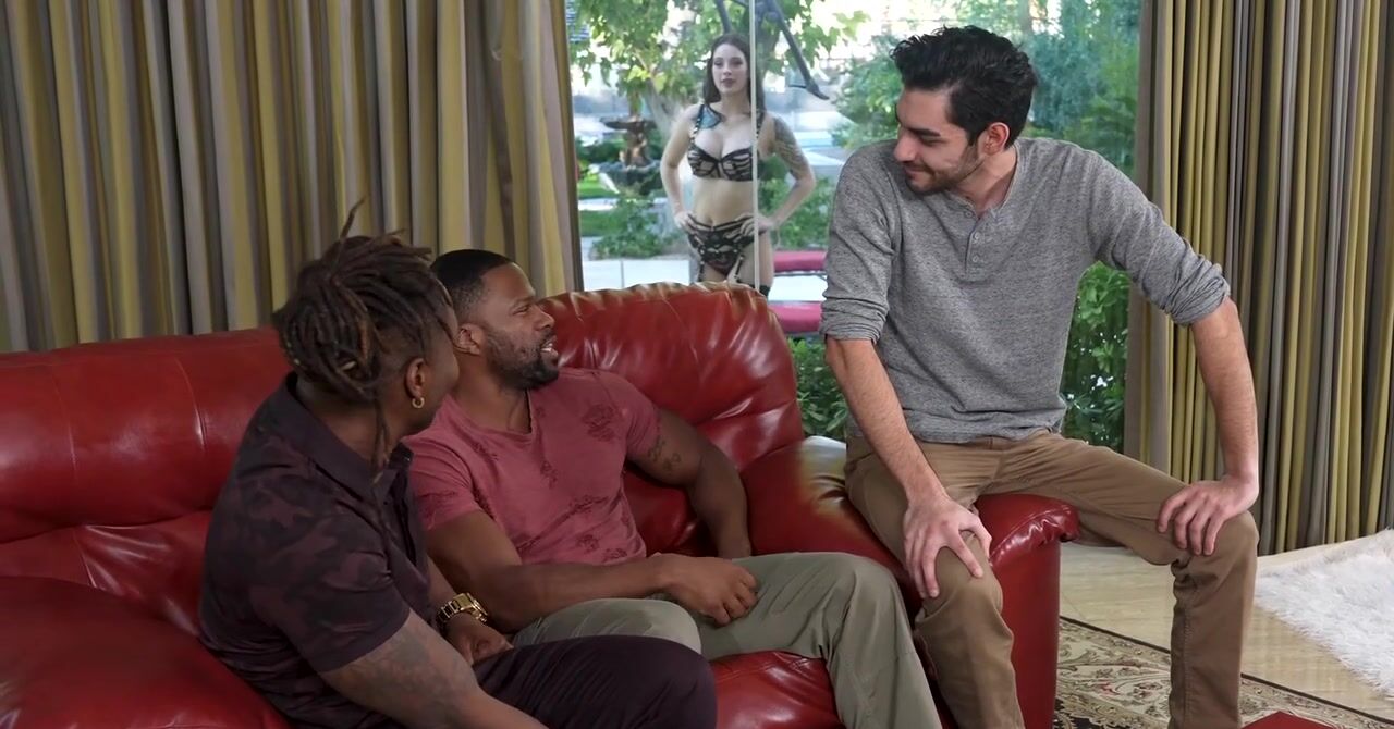 «Белому мужу в кайф то, что делает его развратная женушка. Эта татуированная красотка надевает своё самое сексуальное белье и отдается сразу двум неграм. А куколд смотрит на измену со стороны и снимает всё на видео, нереально возбуждаясь. Брюнетка с силиконовыми сиськами так сильно возбудилась от МЖМ, то даже отдалась в попку и попросила порадовать её двойным проникновением, испытав сильные оргазмы.»