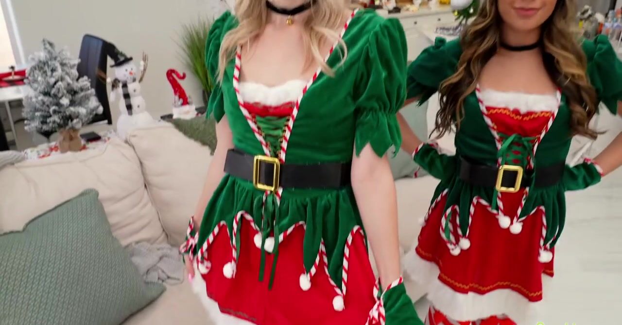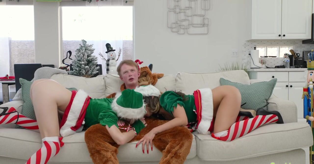 «Этот новый год парню запомнится надолго, ведь он проводит праздник с двумя сводными сестрами, которые предлагают заняться групповым сексом. Блондинки надевают праздничные наряды и соблазняют молодчика на ЖМЖ. Чувак даже представить не мог, что когда-нибудь его мечта воплотиться в реальность. Он много раз это представлял и ночами дрочил на фантазии о ебле с сестричками, а сейчас наслаждается их кисками и ротиками.»