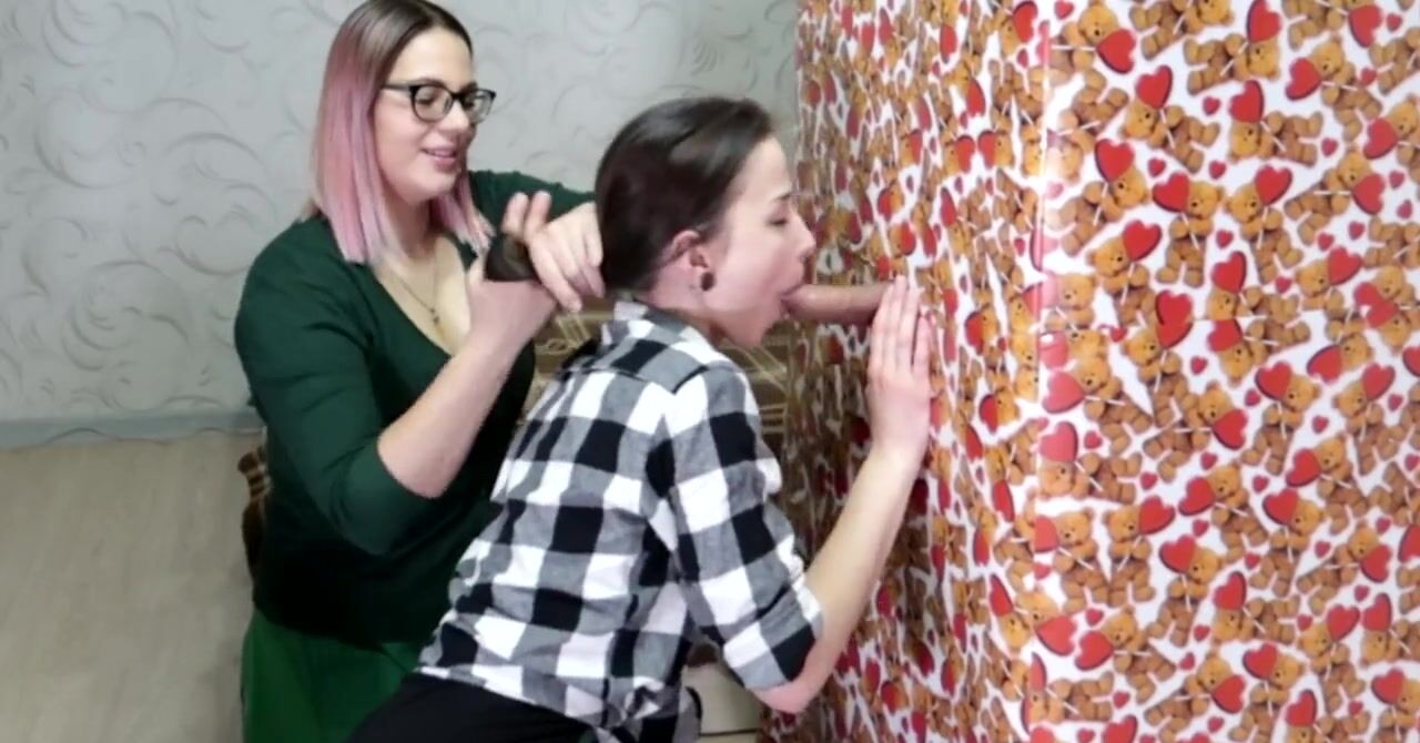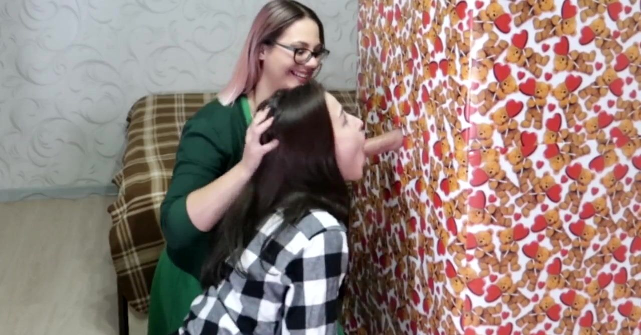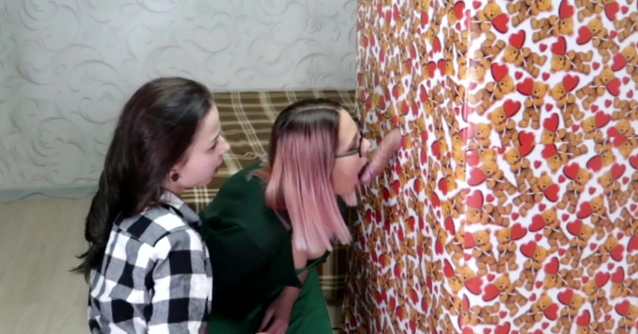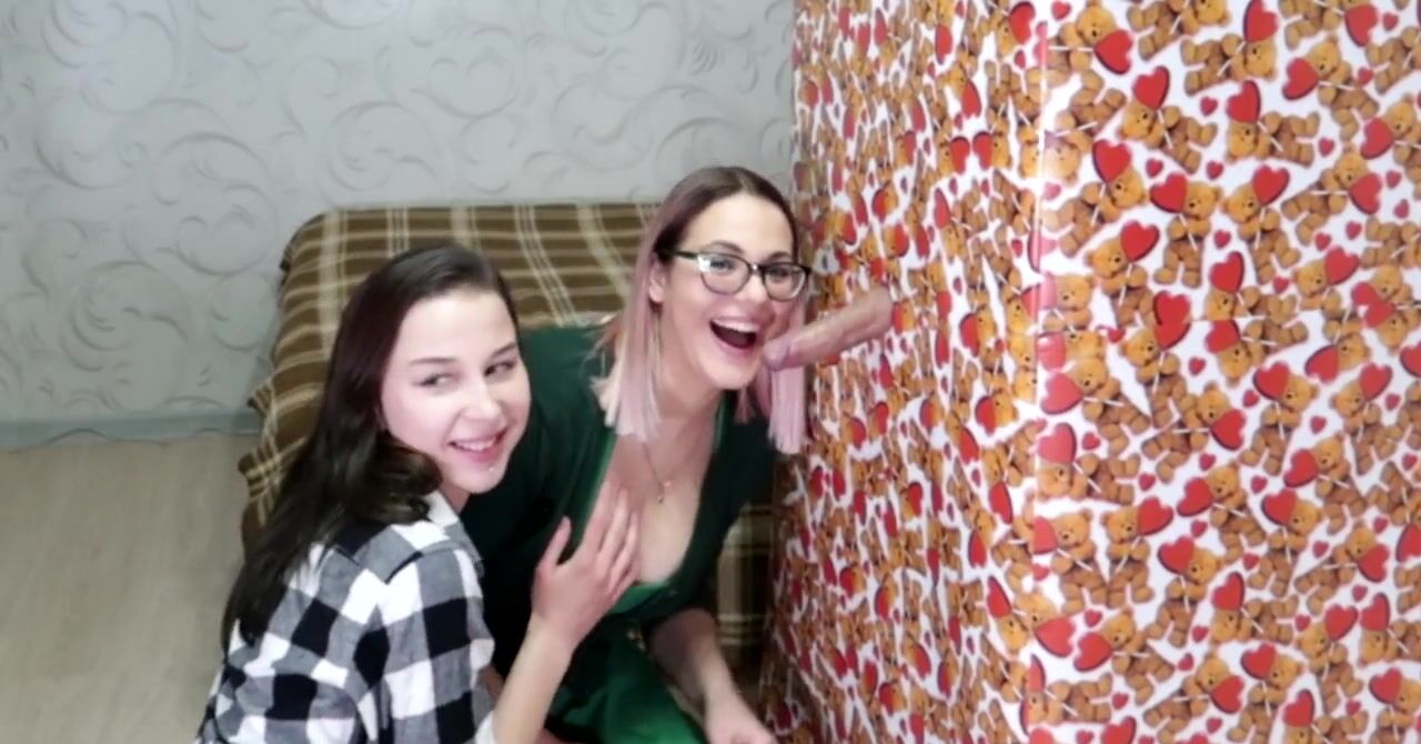 «Парень делает необычный подарок для двух развратных подруг. Он залезает в праздничную коробку и высовывает из неё хуй через дырку. Две подружки знают, что нужно делать со стоячим членом, они опускаются на колени и принимаются как следует работать своими умелыми ротиками, отсасывая крепкий хер. Сосать подружкам нравится даже больше, чем трахаться, они вместе полируют крепкий хер и подставляют лица под сперму.»