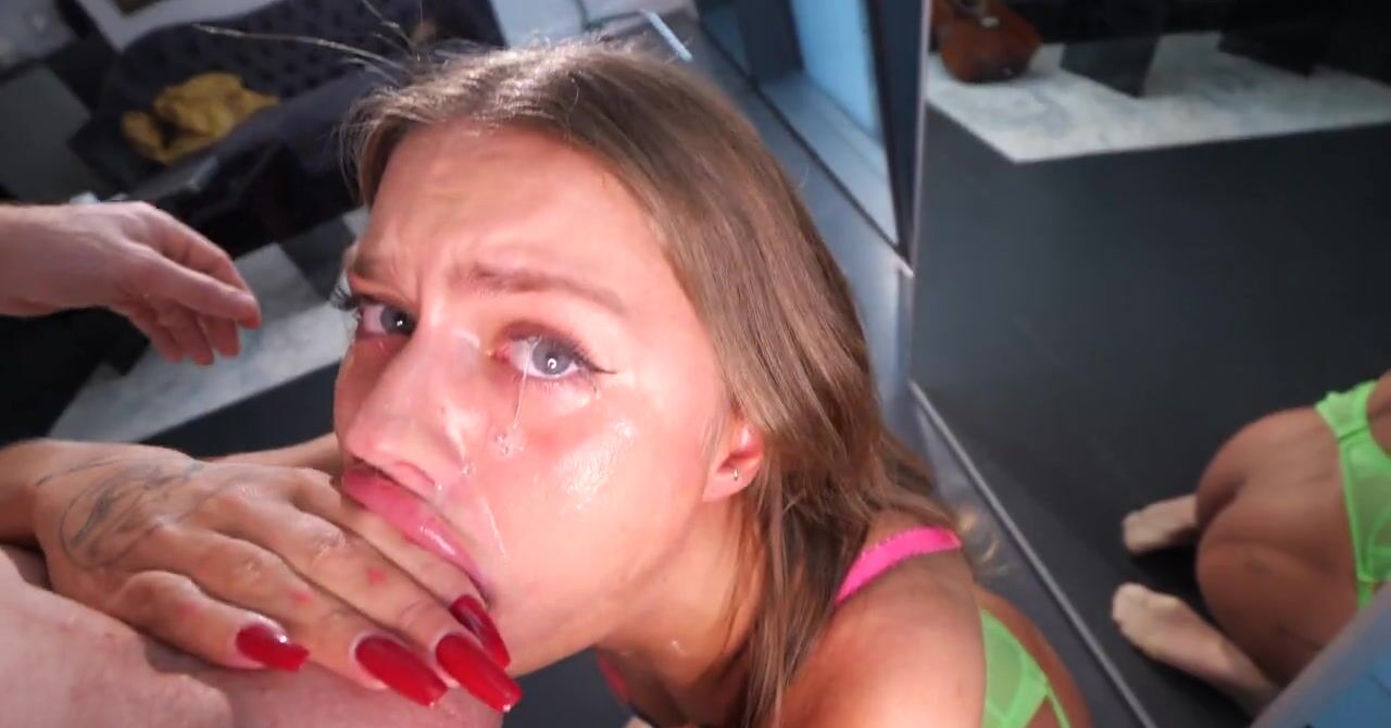 «Такой спор доставляет нереальный кайф, наивная девка поспорила с приятелем, что у неё получится взять его хуй в рот по самые яйца. Эта наивная 18 летняя цыпочка так и не поняла, что чувак её нагло развел на оральный секс. Она опустилась на колени и с победным видом заглотила болт полностью, вот так умеет её глотка, и никакого рвотного рефлекса. Ну что же, раз начала, то нужно и закончить, добыть сперму в ротик.»