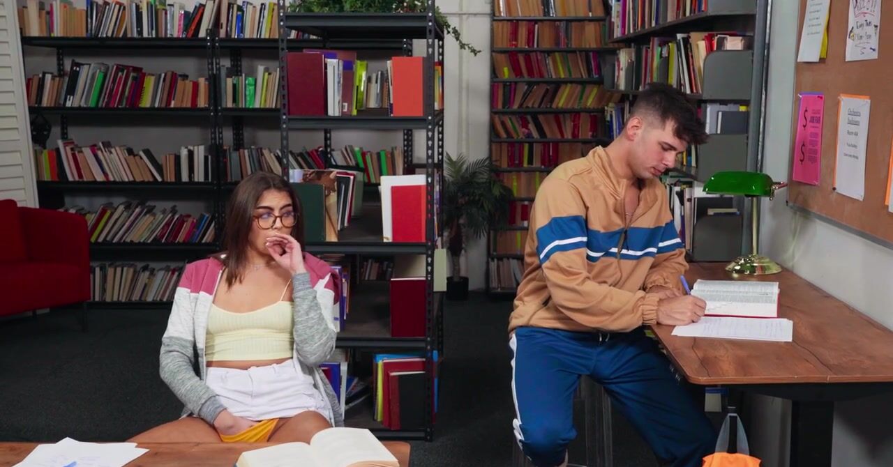 «Библиотека закрывается вместе со студентами, которые как раз занимались сексом и не успели уйти вовремя. Ну и пускай, эта возбужденная парочка не против трахаться тут хоть целую ночь. Только вот это нужно делать очень тихо, чтобы охранник их не заметил. Сперва чувак вылизывает киску милой однокурсницы в очках под столом, а потом уже засаживает крепкий член в её щелку и жарко трахает похотливую крошку.»