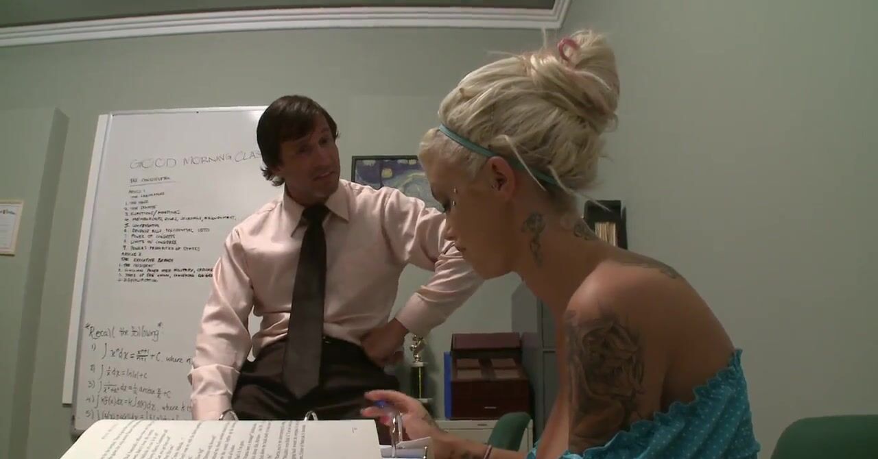 «Грудастая студентка задерживается после занятий совсем не для того, чтобы преподаватель лучше пояснил новую тему. Эта привлекательная блондинка собирается соблазнить его, девушка уже давно хотела секса с этим учителем. Она не стала долго тянуть, а почти сразу же предложила ему интим. Она взялась делать глубокий минет и отдалась в бритую пизду на столе, получив удовольствие. Учитель её поимел довольно грубо.»