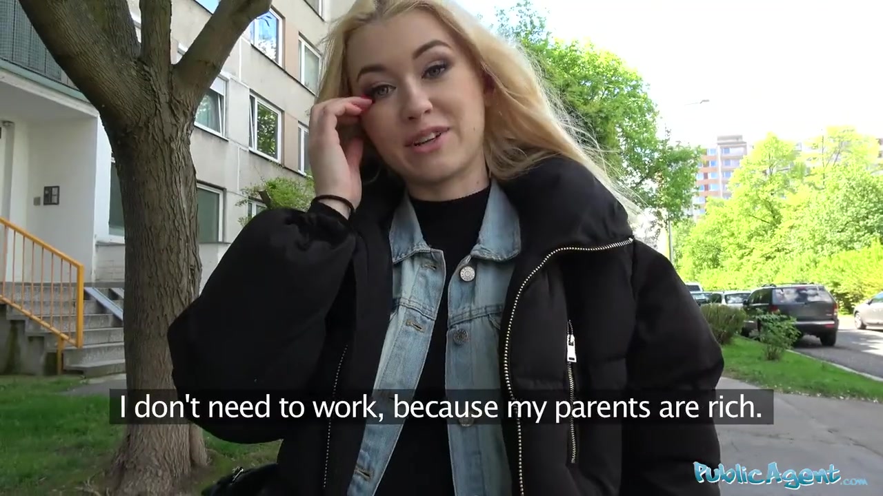 «Миловидная блондиночка мило щеголяла на учебу, когда к ней подкатил агент с интересным предложением в виде приятного заработка, от которого эта сексапильная студентка не стала отказываться. Получив на руки первоначальную сумму денег, роскошная девушка прямо на улице показала ухажеру различные интимные места, после чего найдя местечко по безлюднее, белокурая бестия без промедлений приступила к умелой работе губками, побаловав член кобеля фантастическим оральным экстазом, который становился все сильнее по мере продвижения их жаркой ебли на свежем воздухе.»