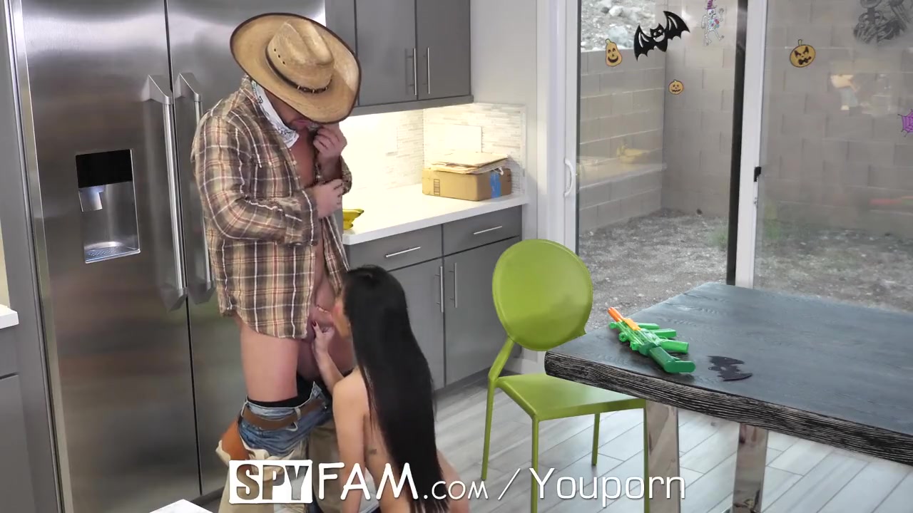 Ковбой активно ебет волосатую дыру азиатки на кухонном столе