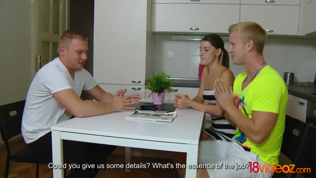 «Симпатичная краля наведалась на кухню где сидел парень, который вскоре предложил малышке немного подзаработать денег, переспав с его лучшим другом. Данная сделка показалась девице очень соблазнительной, и как только дружок переступил порог их квартиры, длинноногая брюнетка сразу обнажила бритую киску, и стала возле счастливчика на коленки, демонстрируя полную готовность взять у него в рот. С поставленной задачей опытная соска справилась на отлично, после чего дала жеребцу оприходовать ее узенький анал. Чувак ебал телку в задницу до изнеможения, получив в финале фантастическое ощущение полного удовлетворения.»